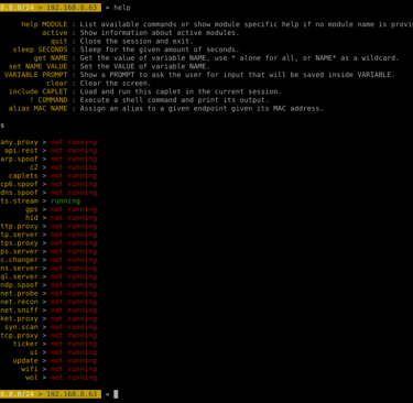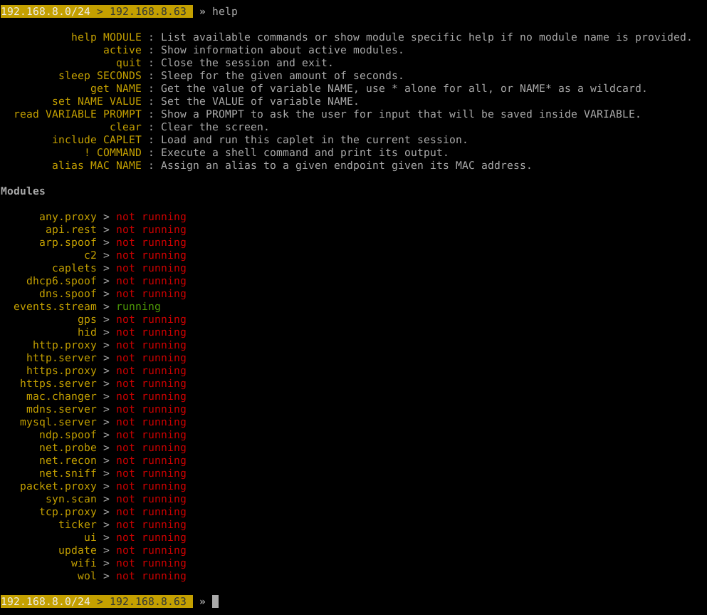 Digitar o comando help dentro do prompt do bettercap, irá exibir todos módulos habilitados. Ele trás opções bem intuitivas. No exemplo abaixo, ele exibe apenas o módulo "events.stream" rodando, pois é o padrão dele.
